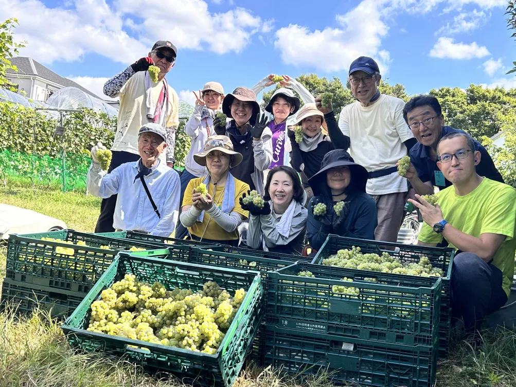 食用のぶどう狩りでは棚仕立てで主幹からぶどうの実が垂れ下がっ ていますが今回は垣根仕立てのぶどうの収穫で時にコブのように主 幹に真横にピッタリくっついてハサミを入れるのも大変だったりし ます。持った時にどの実もしっかりしていて嬉しくなります。